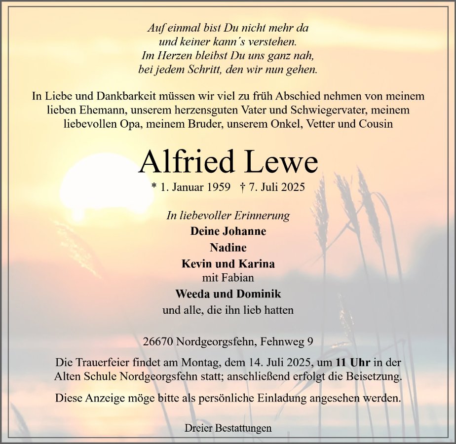 in dieser Zeit des Schmerzes wünschen wir Ihnen Kraft, den Verlust im Kreise Ihrer Liebsten zu verarbeiten. Als Zeichen unserer Anteilnahme und des Gedenkens entzünden wir dieses erste Licht. Möge diese Gedenkseite Ihnen helfen, Erinnerungen zu teilen und so das Andenken gemeinsam wachzuhalten.