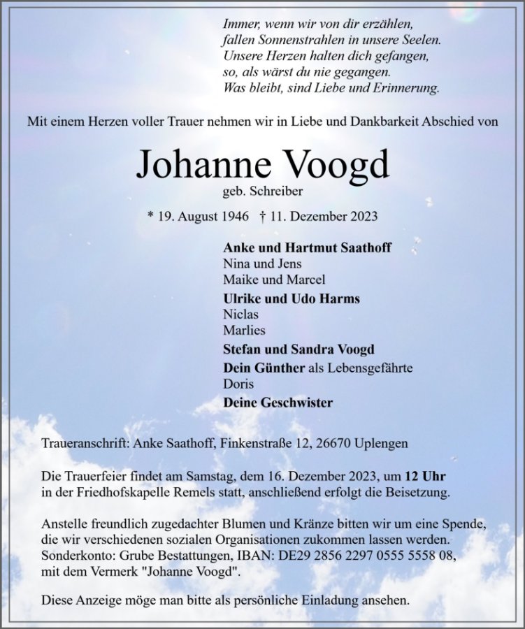 Wir wünschen euch viel Kraft und werden Johanne in liebevoller Erinnerung behalten