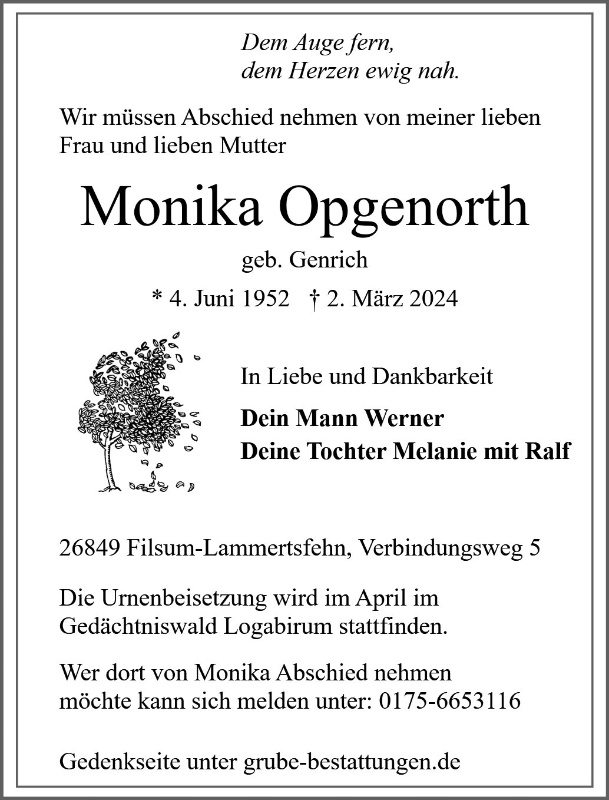 Wir wünschen ganz viel Kraft für diese schwere Zeit.Sie wr ein ganz besonderer Mensch.Agnes und Andree Meyer Filsum