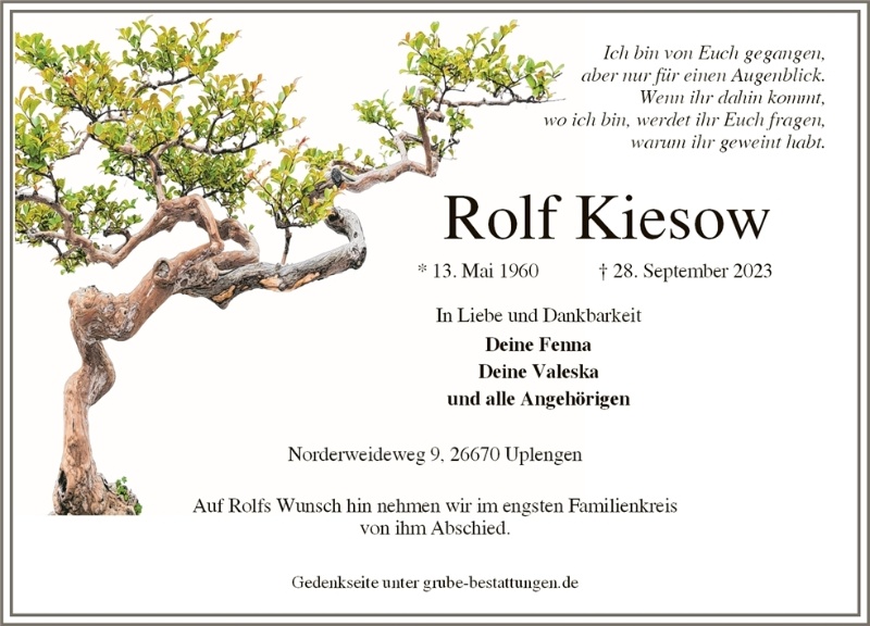 herzliche Anteilnahme am Tod von Rolf